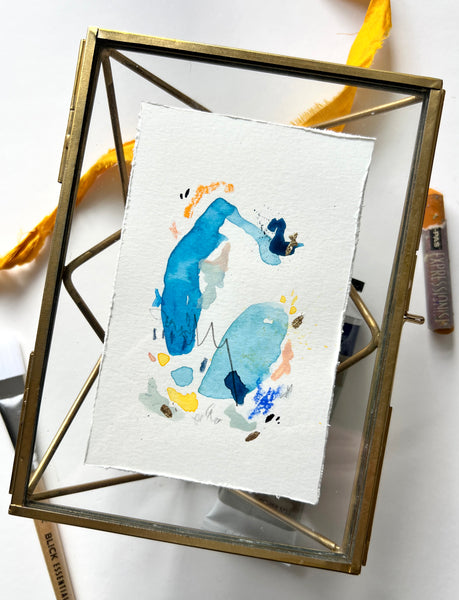 This is a framed, original acrylic painting on watercolor paper with a deckled edge. I've also added some small details in pencil and oil pastel, as well as just a touch of gold leaf. This frame is 4x6" frames. It's still made to stand on a table or shelf, and is signed and titled as shown.