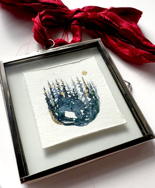 The ornaments are slightly larger than previous years, with silver frames measuring approximately 3”, painted on fine art watercolor paper. The frames are glass with a hinged door and they're hung with reclaimed silk ribbon.  They are signed on the back.