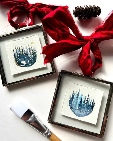 I am happy to once again offer a selection of framed watercolor forest ornaments. Each forest is unique, with its own little bit of shine or veil of winter snow. I hope you find one that's just right to commemorate a favorite adventure or perhaps to gift to a favorite person who's a little wild at heart.