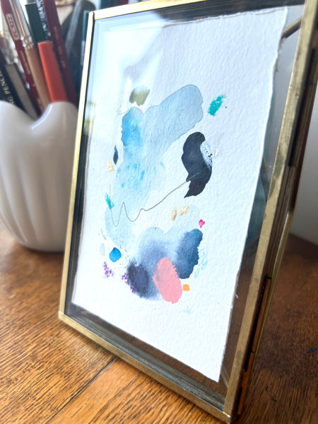 This is a framed, original acrylic painting on watercolor paper with a deckled edge. I've also added some small details in pencil and oil pastel, as well as just a touch of gold leaf. These paintings are just under 4x6" and the frames are made to stand on a table or shelf. They are signed and titled on the back, as pictured.